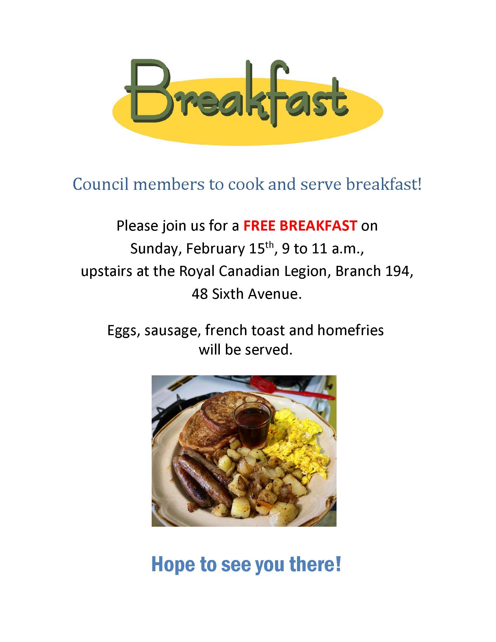 Free Council Breakfast, 9 – 11 a.m., Royal Canadian Legion, Br. 194 upstairs hall