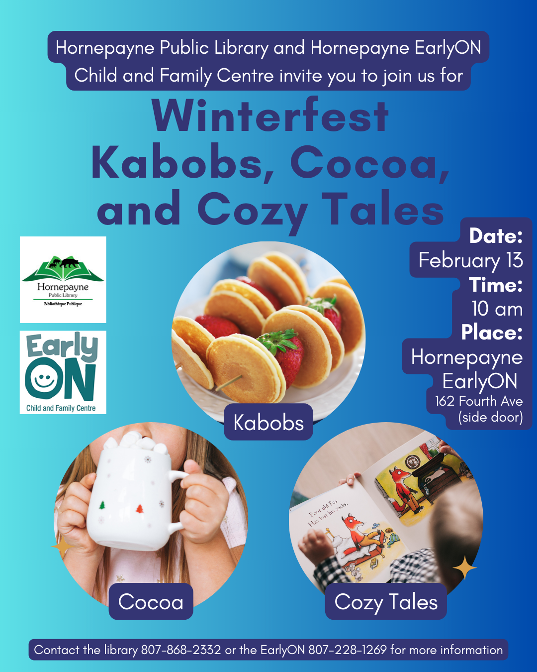 Winterfest Kabobs, Cocoa and Cozy Tales, 10 a.m., Hornepayne EarlyON Centre