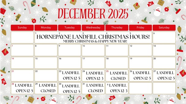 The Township of Hornepayne, and our landfill contractor Hornepayne Service Centre, service the community with weekly curbside garbage collection and landfill site operation.